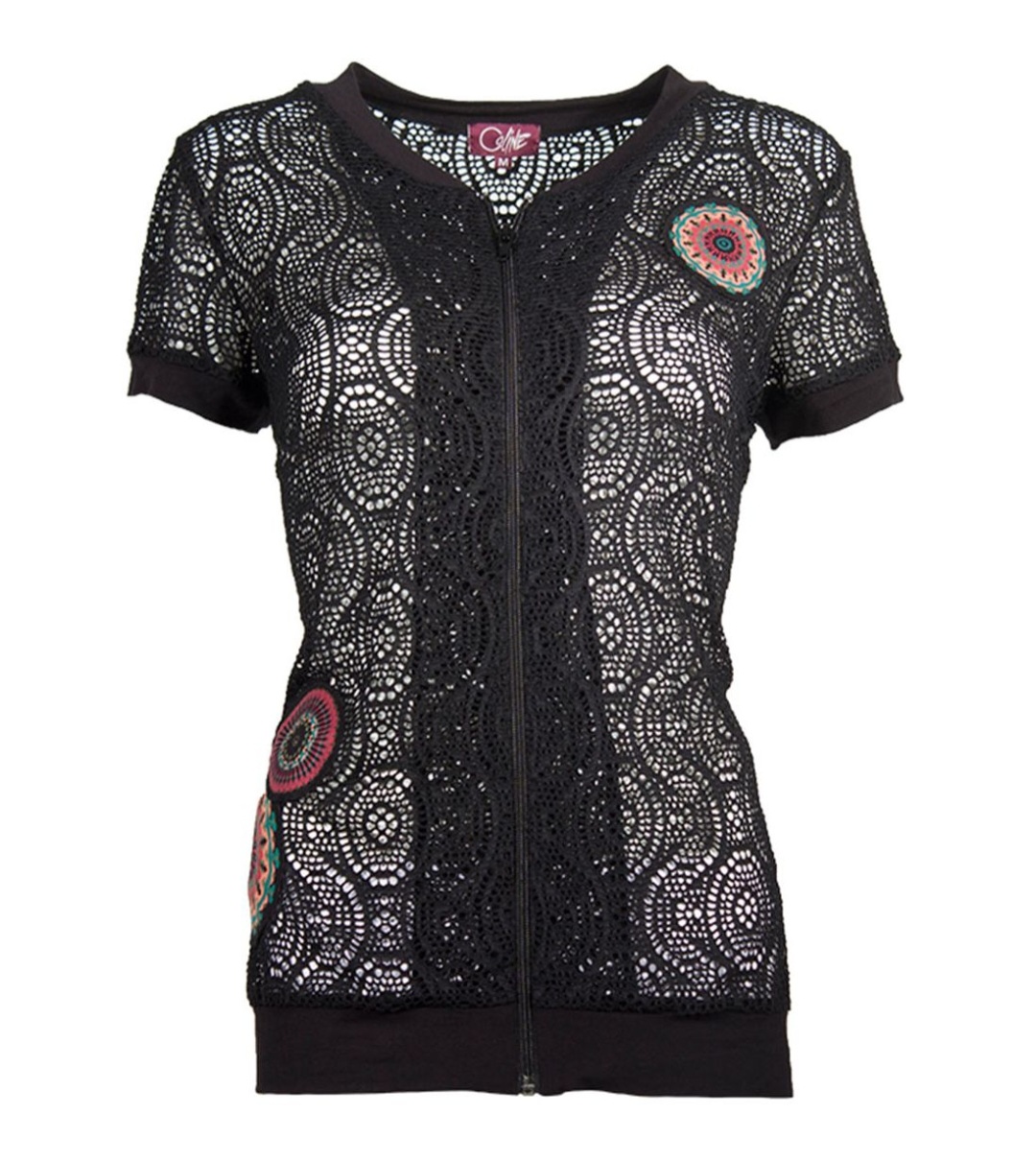Chaqueta de verano de mujer. Manga corta efecto crochet transparente. Estampado de mandala.| Color | NEGRO |