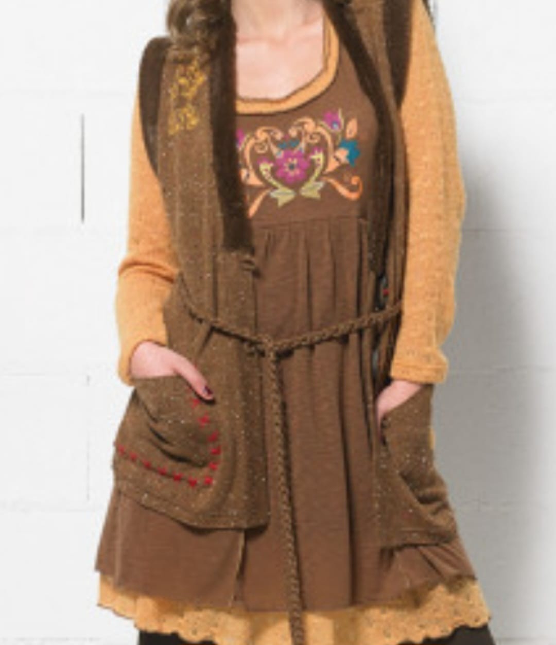 Chaqueta sin mangas de lana. Cuello y sisas de pelitos. Bordados, cinturón y bolsillos.
